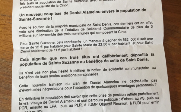 Une lettre circulaire a été distribuée dans toutes les boîtes aux lettres de la commune de Sainte-Suzanne et signée des élus communautaires de la CINOR et de la majorité municipale de Sainte-Suzanne....