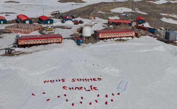 Photo réalisée par les hivernants de la base Dumont d'Urville de la Terre Adélie (Antarctique) s'associant à la mobilisation citoyenne nationale et exprimant leur solidarité avec les victimes des...
