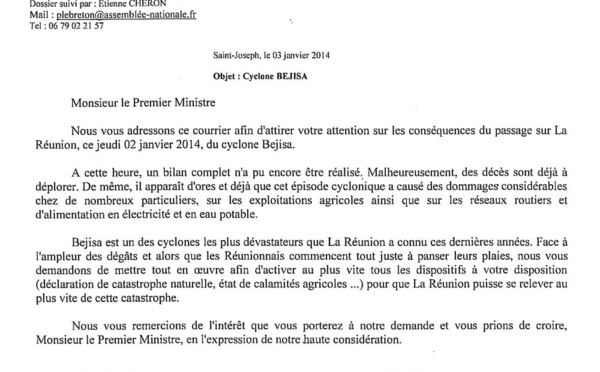 Un courrier des Parlementaires du PS-Progrès au Premier Ministre suite au passage du cyclone Bejisa. Messieurs Patrick Lebreton, jean Claude Fruteau, Jean Jacques Vlody, députés PS de La Réunion et...