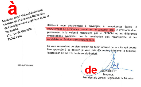 Le Sénateur Didier ROBERT demande à la Ministre Najat Vallaud-Belkacem de reconsidérer la nomination du Secrétaire Général au Rectorat de La Réunion.